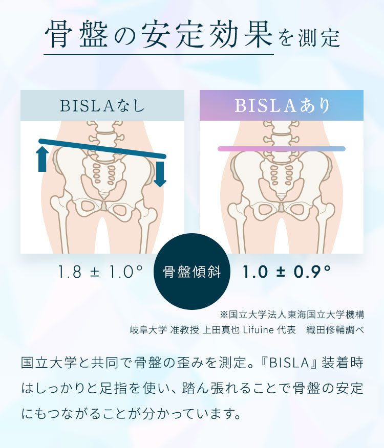 足の専門家の研究で、BISLAを装着すると骨盤が安定するという結果がでました。上半身と下半身をつなぐ骨盤の安定は美姿勢、美脚には欠かせません。